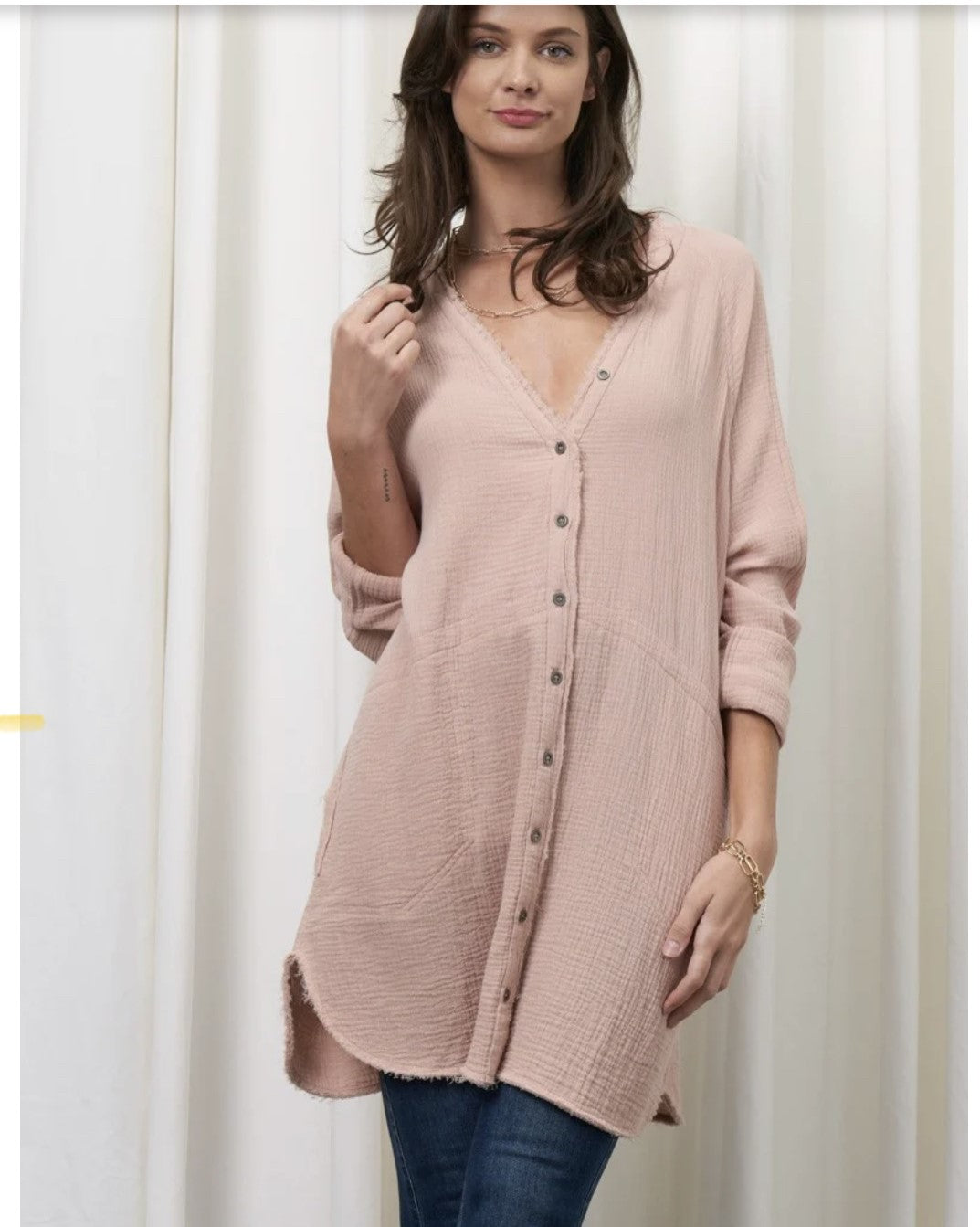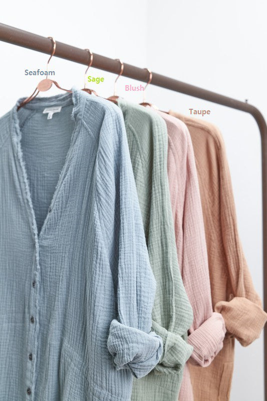 This OVERSIZED BUTTON DOWN SHIRT DRESS exudes a refined elegance, crafted from lightweight cotton gauze for a luxuriously soft feel. Featuring oversized buttons and a pocket on the chest, this sophisticated piece will take you from day to night with ease. The model stands 5' 7" tall and wears size Small for a more exclusive statement. Preferred care: hand wash cold.