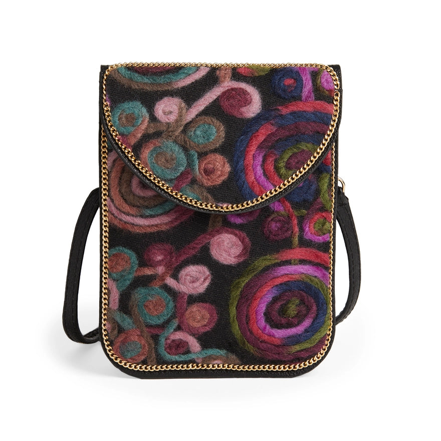 Slim bag with decorative felt designs, fits the latest cell phone brands, snap flap closure and crossbody strap.