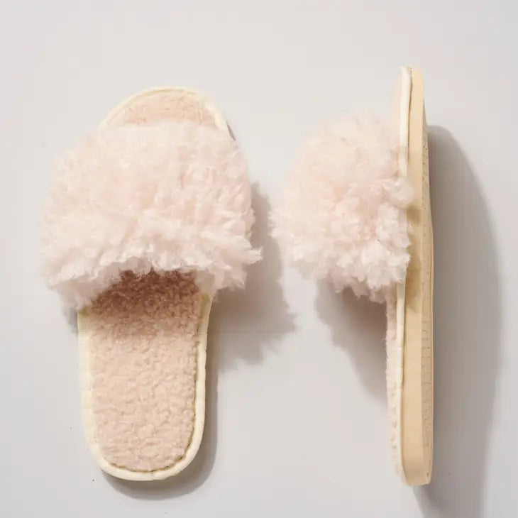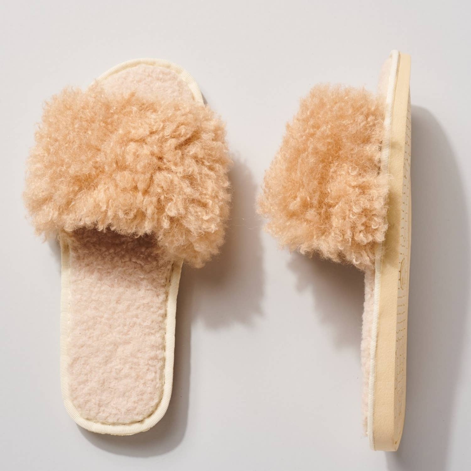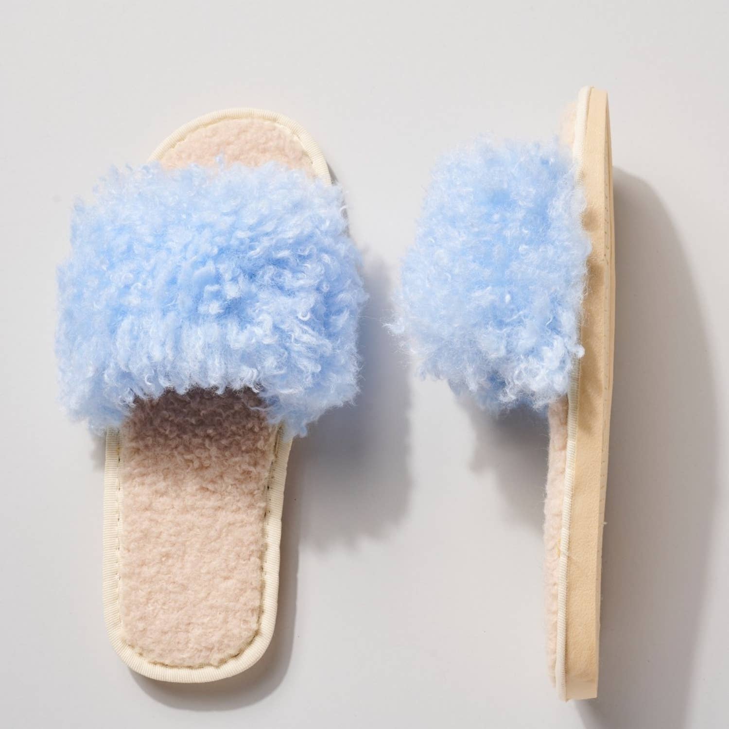 Faux sherpa fur slippers in solid colors. Available sizes: S(6/7), M(8/9), L(10/11) Please consider that sizes tend to run smaller than expected. Material: 50% PVC, 50% Polyester