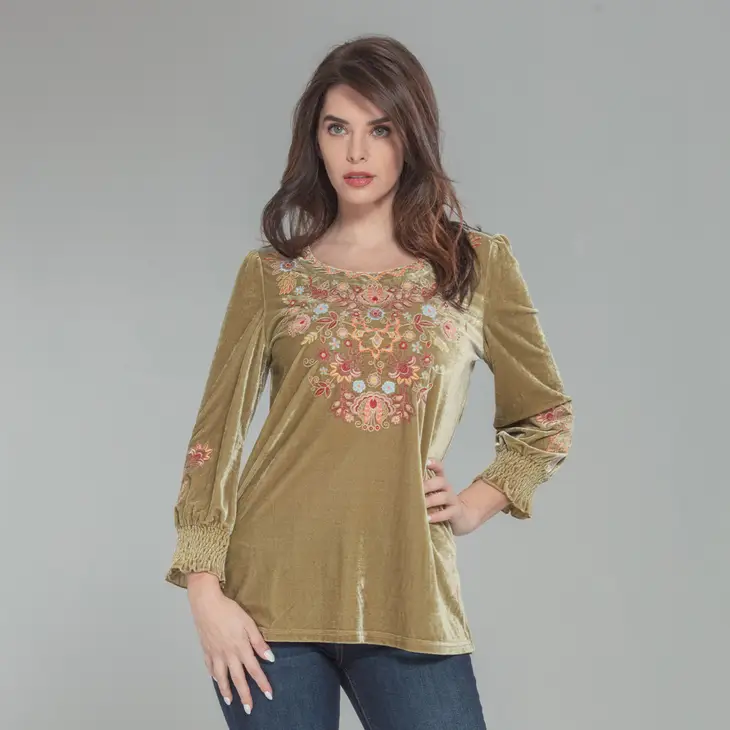 Indulge in the soft luxuries of our Velvet Puff Sleeve Tee. Crafted from the finest stretch velvet, it features a scalloped neck and smocked cuffs for a secure, yet comfortable fit. Exquisite embroidery detail adorns the front, culminating in a merrow edge to complete the look. This elegant tee will make you feel like a regal, feminine queen.